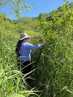 Lora Pennington locating native plants in Sammish River wetlands.